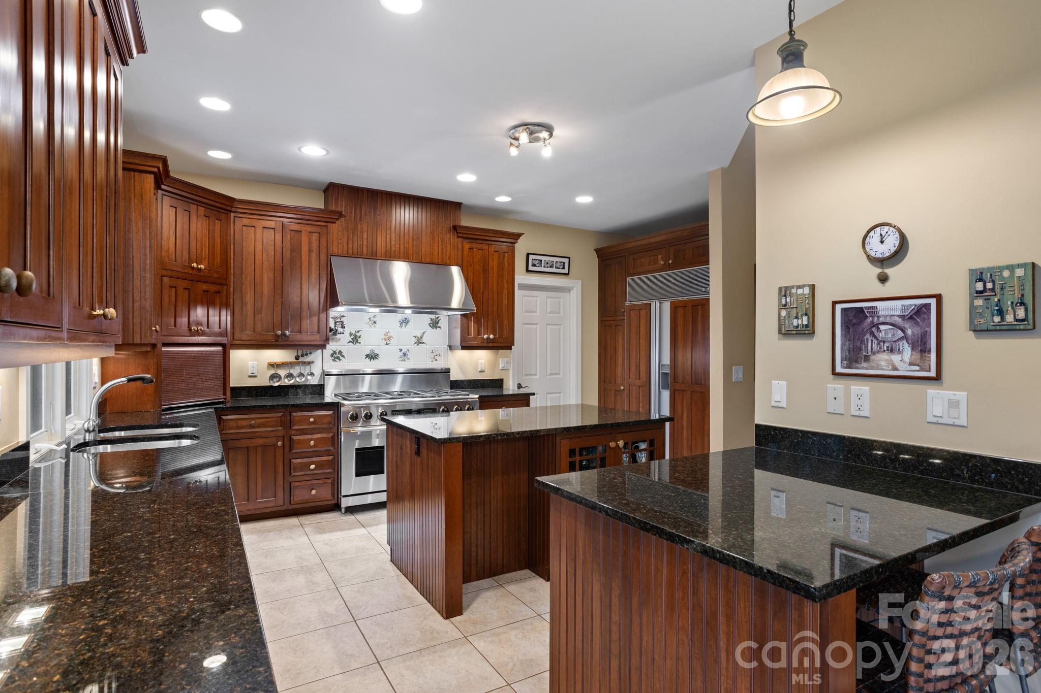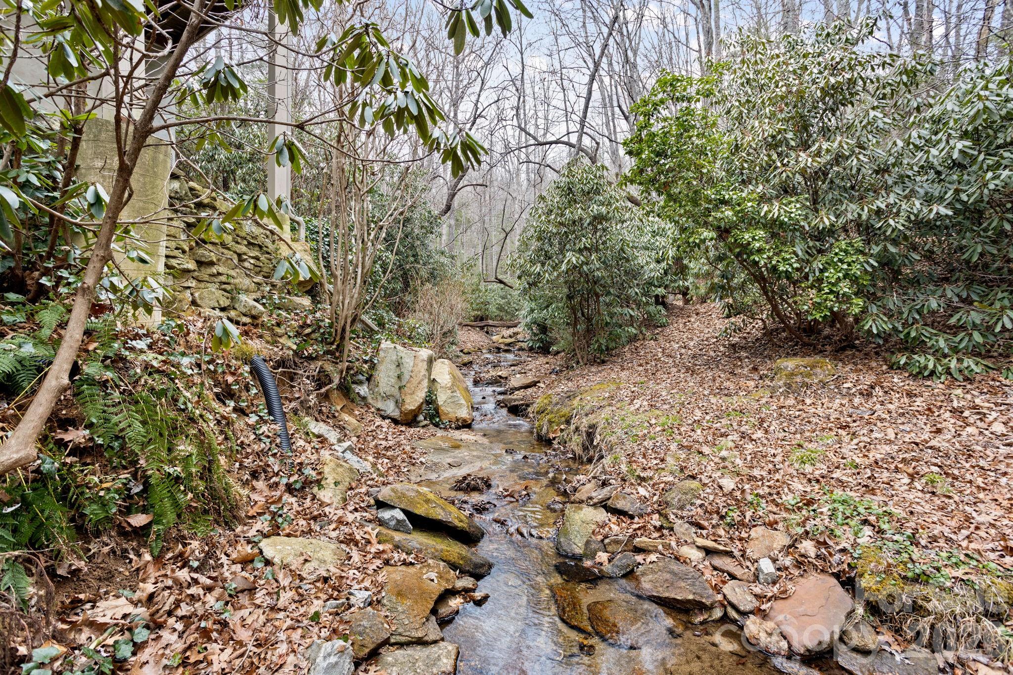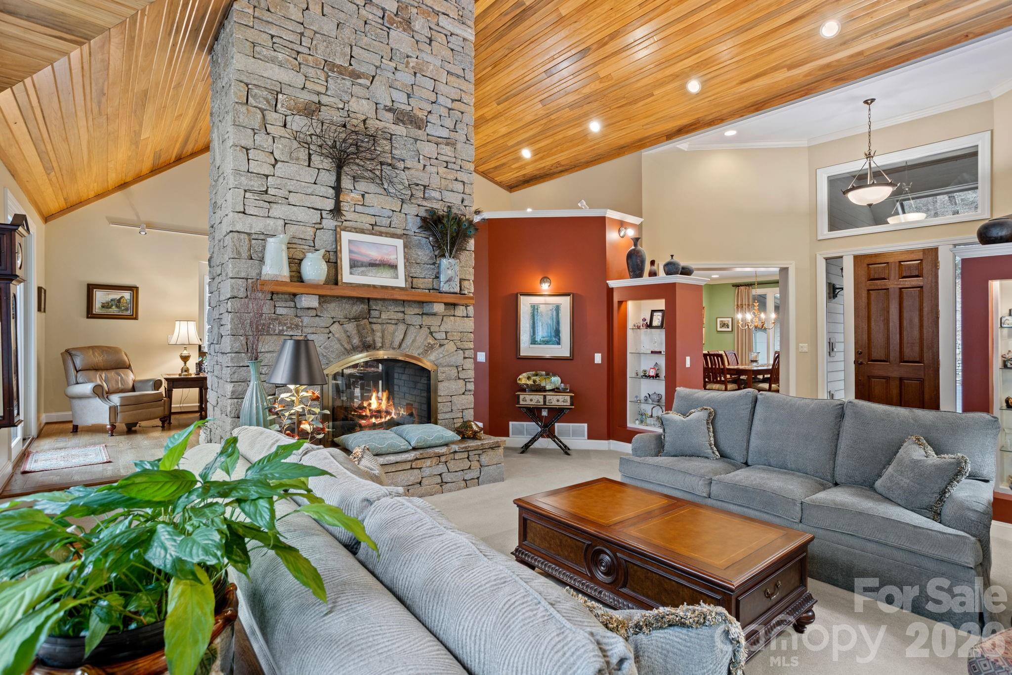 Exceptional luxury home situated on 2 private acres overlooking the signature 17th hole in prestigious Kenmure, a gated golf course community. This truly unique property is surrounded by mountain streams and cascading waterfalls that flow throughout the grounds, creating a peaceful and private mountain retreat. The main level features an outstanding great room with soaring vaulted ceilings and tongue-and-groove willow wood ceiling, complemented by an impressive floor-to-ceiling wall of windows showcasing the natural setting. A stunning stone gas fireplace anchors the space and opens seamlessly to a den/TV room with custom built-ins—ideal for entertaining and gathering with guests. The expansive gourmet kitchen is designed for the serious chef and entertainer, offering high-end stainless steel appliances, including a Dacor six-burner gas range with double ovens and exhaust hood. The sink area is flanked by two Fisher-Paykel dishwashers, along with an Sub-Zero refrigerator/freezer, two islands (one with breakfast bar), granite countertops, and an abundance of cabinetry with unique pull-outs. A breakfast bar and additional casual breakfast space further enhance the kitchen’s functionality. The dining room features a wall of windows, bringing the outdoors in. The expansive primary suite is a private retreat and offers a sitting area, walk-in closet with laundry chute, washer/dryer hook-up plus add’l closet and a private sunroom accessed by 2 glass French doors overlooking the serene landscape and waterfalls. The spa-like bath includes a walk-in tile shower, Jacuzzi tub, double vanity, large linen closet and vaulted ceilings. Also on the main level is a beautiful study with large picture windows, palladium accents, walk-in closet, vaulted ceiling and tongue-and-groove willow wood ceiling. A gorgeous powder room with vessel sink and custom vanity adds elegance, while the mudroom off the garage includes an additional half bath. The lower level is perfect for entertaining, featuring a large family room/recreation area with bar, sink, beverage refrigerator, and seating. A dramatic floor-to-ceiling stone wood-burning fireplace is enhanced by a convenient dumbwaiter for transporting firewood. Two guest bedrooms and two en-suite guest baths complete this level. The laundry room offers cabinetry, sink, and a convenient laundry chute from the primary suite. Additional features include a dog-washing station and planting/garden area in mudroom and a heated and cooled workshop. Outdoor living is truly exceptional with multiple levels of decking, tranquil waterfalls, flowing streams, and private walking trails throughout the property with footbridge to the golf course—all while overlooking the 17th signature hole of the golf course. Additional highlights include a three-car garage with rear golf cart access and its own driveway, new roof, whole-house generator, two HVAC systems and two water heaters. Ideally located just minutes from the entry gate and Kenmure’s outstanding amenities. A rare opportunity to own a luxury mountain home offering privacy, views, and an unparalleled natural setting.