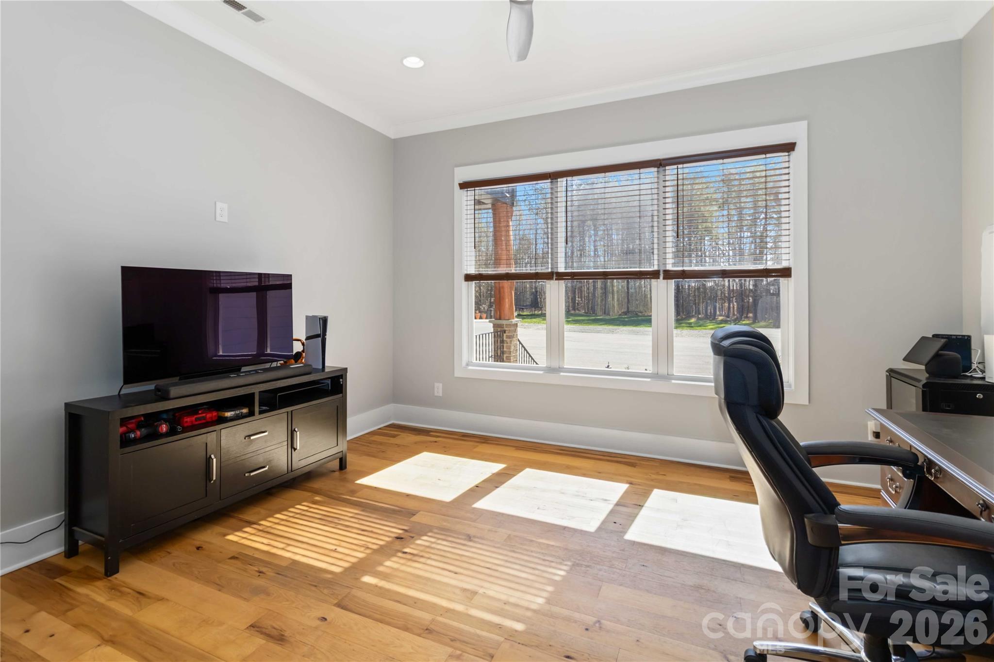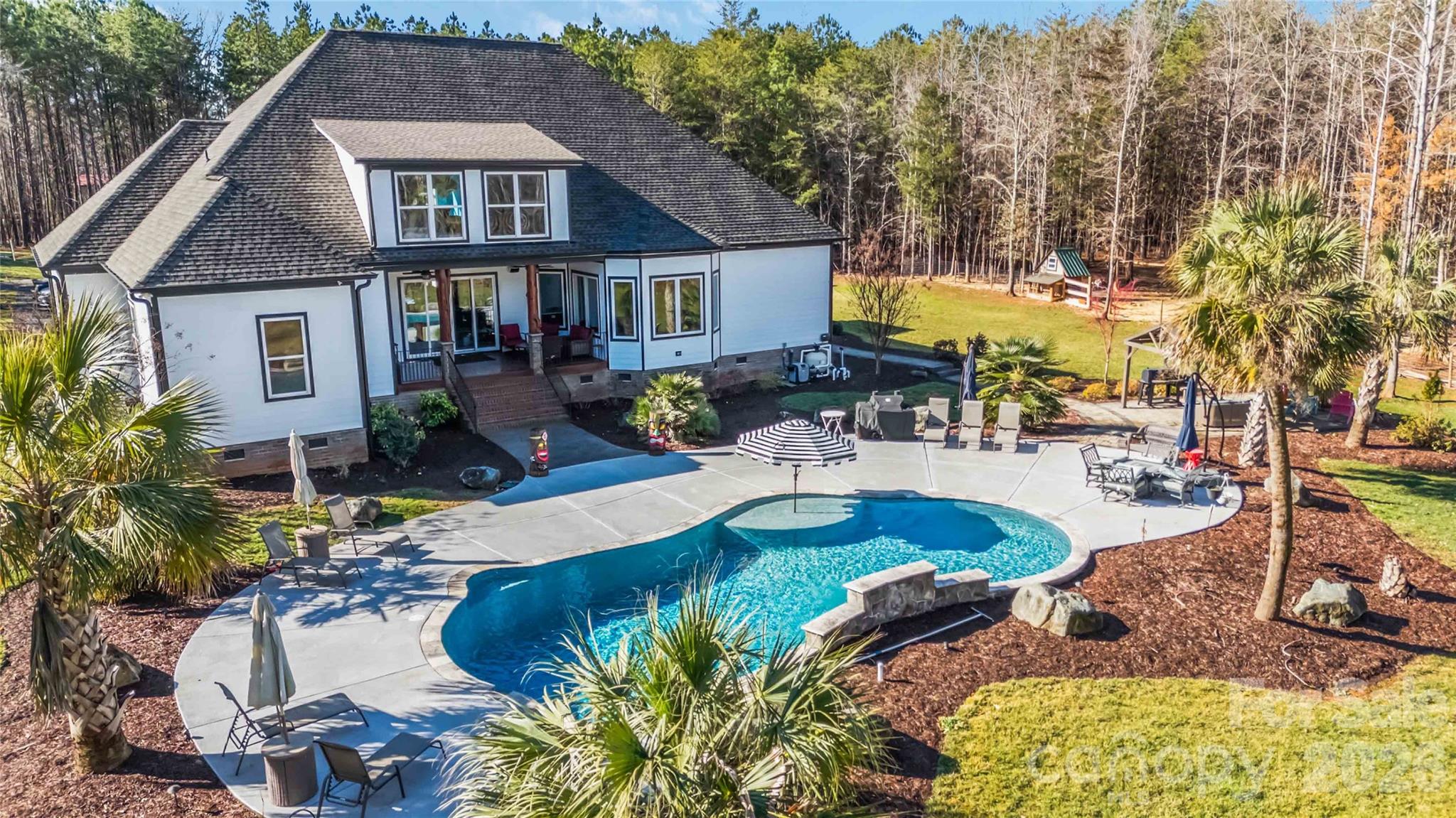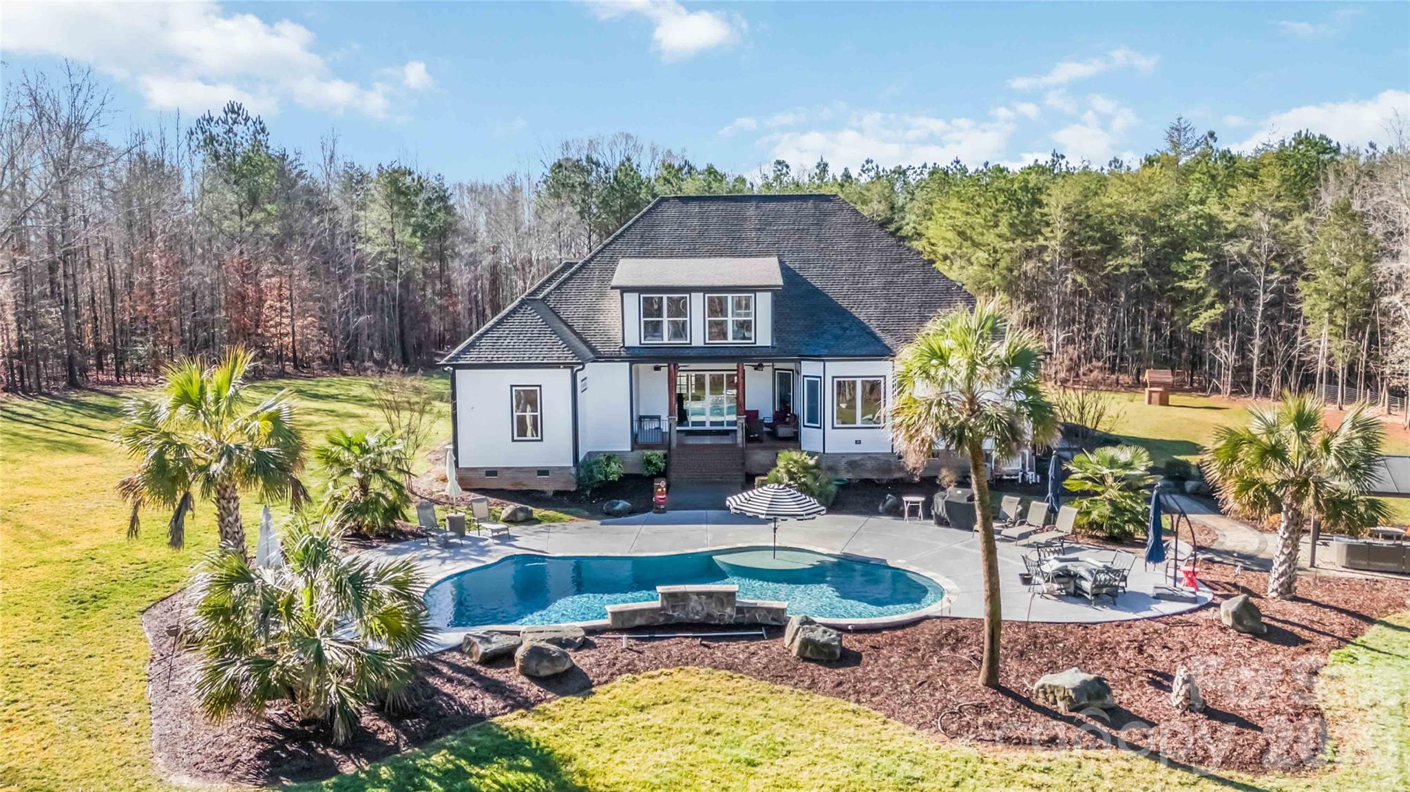 Tucked away on nearly 12 private acres, this exceptional luxury estate offers the perfect balance of seclusion and convenience—just 10 minutes to Rock Hill and 15 minutes to Lake Wylie. A stunning koi pond and dual waterfalls welcome you at the front of the home, setting the tone for the thoughtfully designed custom walkways that lead through the property. And don't miss the custom-made porch posts claimed from trees on the property! The main residence features 5 bedrooms and 5 full baths, with all bedrooms conveniently located on the first floor in a split plan design. The spacious primary bedroom leads to a large ensuite bathroom with soaking tub and oversized tile shower. A second owner bedroom across the home also has an ensuite bathroom. Off the foyer, the dedicated office with custom-made sliding doors provides an ideal work-from-home space. An open concept allows for ease of gathering together on the first floor. The Sonos® surround sound allows you to experience a cinema-like movie in the family room and listen to your choice of music in any of the included rooms. Upstairs, enjoy a second living space with a built-in bar, a full bath, and an exercise or flex room—perfect for entertaining or extended living. The attic provides plenty of room for storage. Additional highlights include two tankless water heaters and an additional three electric backups. Outdoor living shines with a covered back porch opening to an expansive patio, complete with a saltwater in-ground pool and waterfall feature, plus a covered pergola ideal for seating and bonfires. There is partial fencing which currently houses the goats, but would be ready for your chickens, sheep or pigs! The 11.8 acres allows for a multitude of activities not limited to boarding horses, hunting and riding off road vehicles. That's not all...the property also includes a large multi-use 40' x 40' building with a heated office and bathroom, currently used for a business. There is additional parking around this building and a dedicated RV parking area with full hookups. A truly rare and versatile property offering luxury, privacy, and endless possibilities.