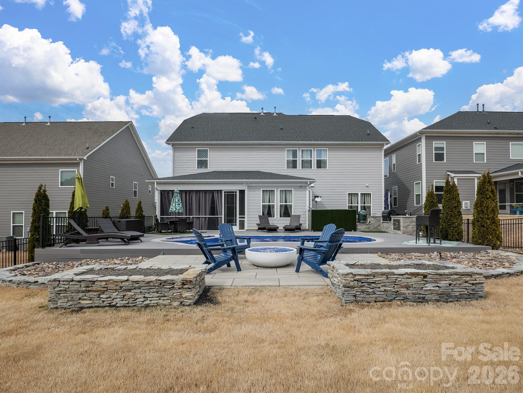 Stunning, model-style home with a heated saltwater In-ground pool and built-in Jacuzzi. Spacious patio featuring an outdoor kitchen and fire pit—perfect for entertaining year-round. Enjoy the screened porch with ceiling fan and a fully irrigated yard for easy maintenance. Permanent track lighting on the exterior of the home that you can control year round via an app. Inside, you'll find a home office off the foyer with French Doors, a large dining room with built-in cabinets and serving countertop. Open floor plan with a gourmet kitchen including a large island, wall oven, convection microwave, and gas cooktop. A guest bedroom and full bath are on the main floor, while upstairs offers a versatile loft. Custom shelves and wall accent the bonus room. A luxurious primary suite with garden tub, dual vanities, walk-in shower, and large closet. Nestled just minutes from Lake Wylie for all your favorite water activities. This meticulously maintained home is truly move-in ready! Part of the Palisades Community, so you can join for a fee to be a part of the Country Club and Golf Course.