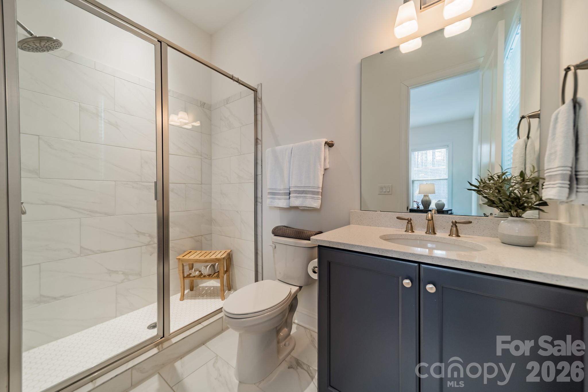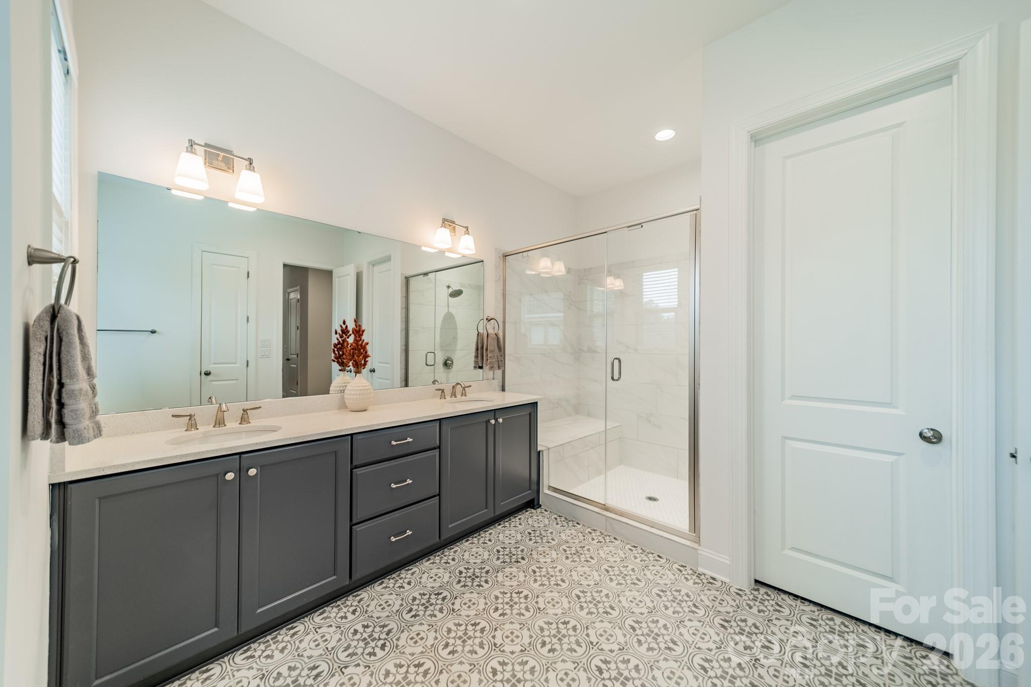 Set on a rare full acre in Fort Mill—well known for its highly desirable public schools—this meticulously maintained home stands out in the sought-after Trinity Ridge community. The sellers have invested extensively in the landscaping, creating a truly special setting with decorative stonework, fresh sod, curated plantings, and custom lighting. Inside, the home shows like a model. A private office with French doors is set across from a formal dining room, which leads into a soaring two-story great room that fills the home with natural light. The great room opens to a spacious kitchen with quartz counters, an oversized island, and a gas cooktop. The main level features both a vaulted primary suite and a private guest suite. Upstairs offers 3 additional guest rooms—one with an ensuite and another full bath—along with a fully soundproofed theater room. The rear screened porch with motorized screens creates a seamless indoor-outdoor retreat, and the epoxy-finished three-car garage with a car lift adds standout function.