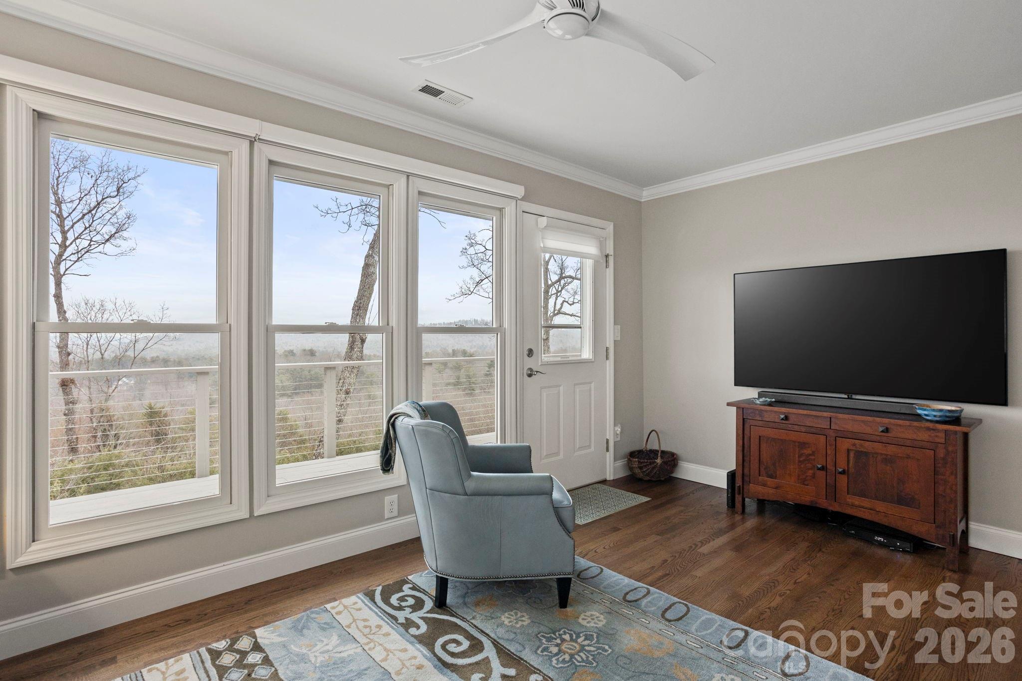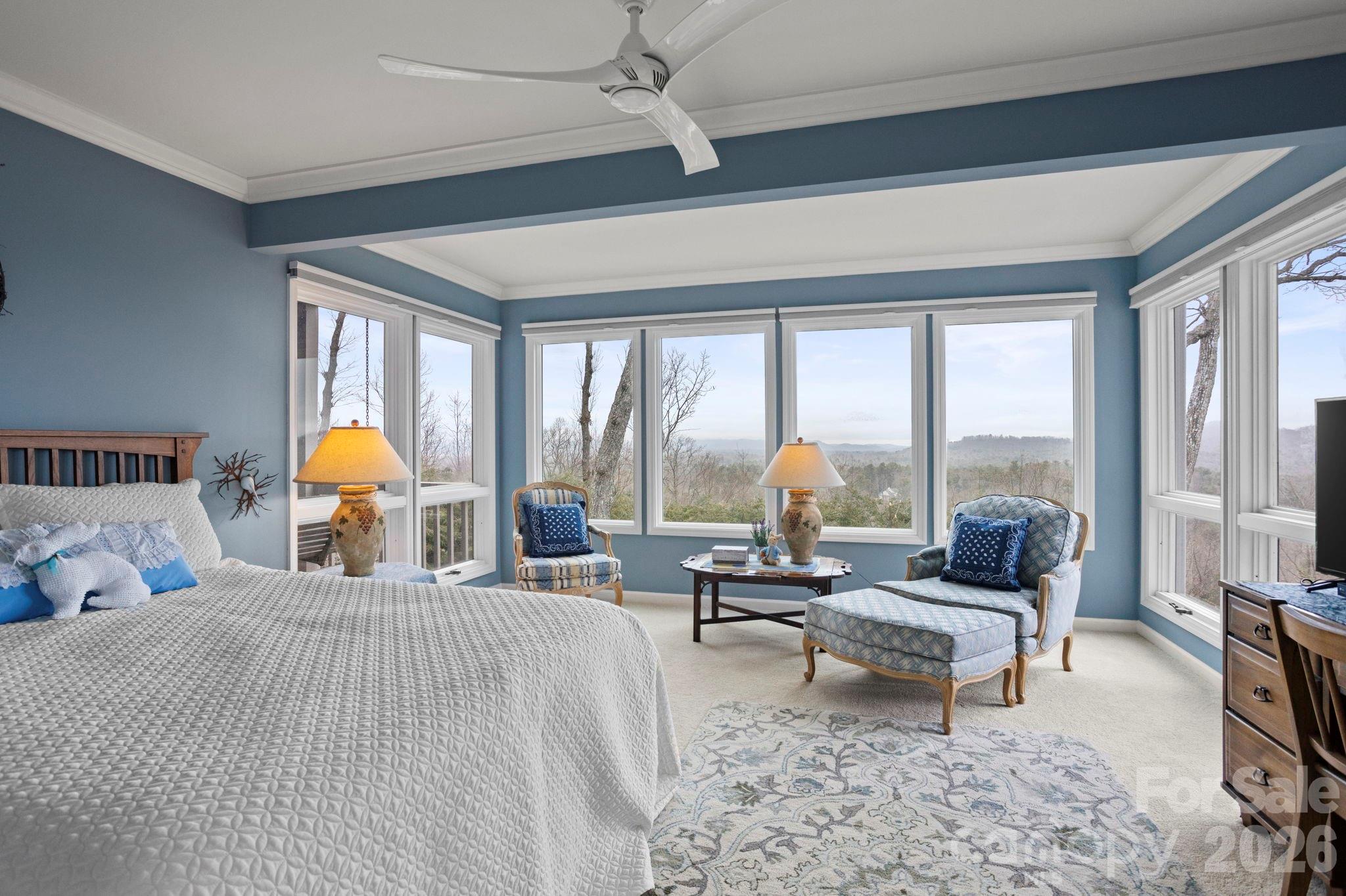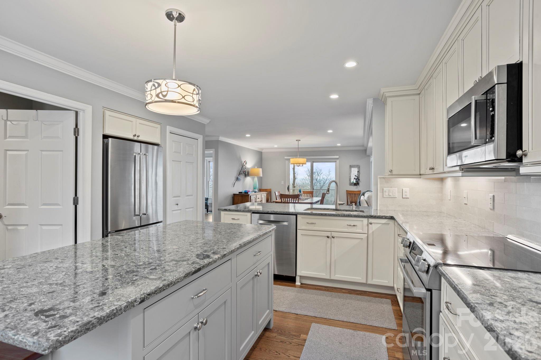 Majestic Long-Range Mountain Views in Prestigious Kenmure. Experience breathtaking panoramic long-range mountain views from this absolutely stunning and exquisitely remodeled four-bedroom, three-bath villa located in the prestigious Kenmure gated golf course community. This exceptional home has been thoughtfully renovated throughout, offering the perfect blend of luxury, comfort and spectacular natural beauty. A level driveway and walkway lead to the inviting covered front porch with cathedral ceiling, setting the stage for the elegance found throughout the home. Inside, the welcoming foyer with tongue-and-groove ceiling opens to an expansive great room featuring beautiful hardwood floors and a dramatic wall of windows that perfectly frame the never-ending mountain views. A gas log fireplace with decorative mantle and built-in display niche creates a warm focal point while the open layout flows seamlessly into the elegant dining area. The dining room opens to a spacious deck with cable railing, providing the perfect place to entertain or relax while enjoying the breathtaking views and scenery. The adjoining chef’s kitchen is a true showstopper, featuring quartzite countertops, tile backsplash, an abundance of cabinetry with drawers, a one-piece sink, high-end stainless steel appliances, pantry and a large island with storage and breakfast bar seating. There is also a 2nd breakfast bar leading into the kitchen. A wall of windows fills the space with natural light while overlooking the beautifully landscaped grounds. The primary suite is a luxurious private retreat highlighted by a designer walk-in closet with custom hanging system and a spa-inspired bath featuring double quartzite vanity with beveled glass mirrored medicine cabinets, makeup vanity, linen closet, heated towel rack and a stunning tiled walk-in shower with decorative glass tile accents and bench. Wake each morning to magnificent mountain views through the large windows. Also on the main level is a cozy den/TV room with access to the deck, a guest bedroom with generous closet, a beautifully reimagined guest bath with designer wall coverings and decorative vanity, and a laundry room with cabinetry and Speed Queen washer and dryer. Multiple remote blinds throughout the main level add an extra level of comfort and convenience. The lower level offers a versatile family room with slider to the deck, ideal for relaxing or easily used as a study or office. Two additional guest bedrooms are located on this level, including one with a large sitting area surrounded by walls of windows showcasing the expansive long-range mountain views. A stylish guest bath with tiled walk-in shower and waterfall glass enclosure completes the space. Outdoor living is simply spectacular with multiple decks perfect for entertaining, relaxing, or grilling, all while enjoying the beautifully landscaped garden areas and unforgettable views. Additional features include a brand-new roof, tankless water heater with recirculating pump, new exterior paint and generator. A Charter Membership to Kenmure is included with the purchase and the home enjoys a convenient location with easy golf cart access to the clubhouse and community amenities. This truly exceptional villa offers luxury mountain living at its finest in one of Western North Carolina’s most sought-after gated golf communities.