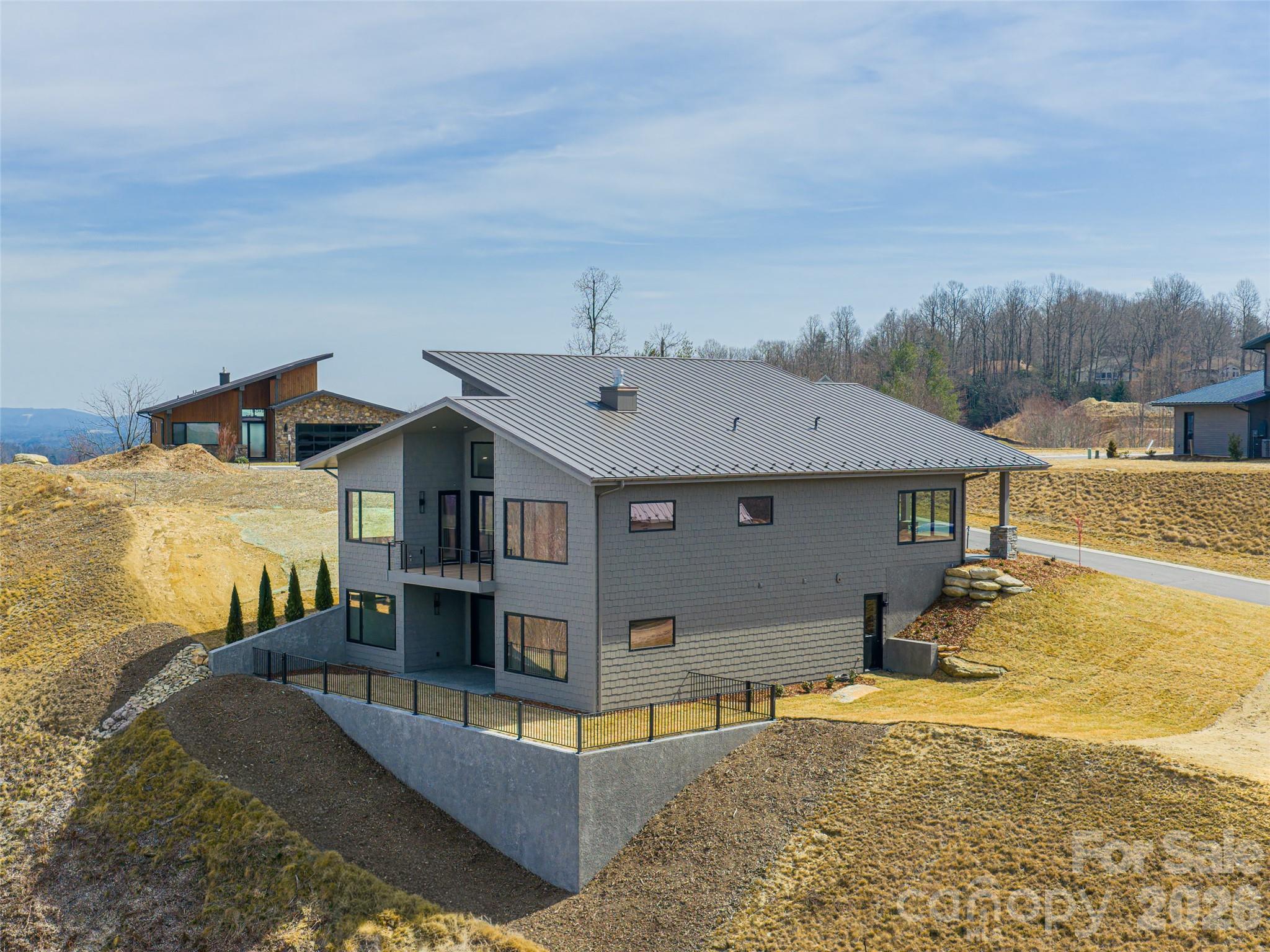 Perched within Summit Vista, the newest luxury enclave inside the gated Carriage Park community, this newly constructed mountain-modern home captures breathtaking, long-range mountain vistas from nearly every vantage point. Designed with a refined lock-and-leave lifestyle in mind, the residence offers exceptional privacy while remaining just 7 minutes from Historic Downtown Hendersonville and a short drive to Asheville Regional Airport. All Summit Vista homes are thoughtfully sited to live privately, yet remain naturally connected to neighbors and the greater Carriage Park community., including 6 acres of shared green space Inside, the open-concept main level is centered around a dramatic floor-to-ceiling stone fireplace, while expansive sliding doors open to a covered Garapa wood patio that showcases the sweeping mountain backdrop - an ideal setting for entertaining or quiet evenings outdoors. The chef’s kitchen pairs modern design with professional-grade performance, featuring elegant Calcutta Virtuoso quartz countertops and a full suite of Thermador appliances. The main-level primary suite offers a serene retreat with direct patio access and stunning mountain views, accompanied by a spa-inspired bath designed for relaxation. The spacious terrace level expands the home’s versatility with a second primary suite, additional guest suite, family room with wet bar, and a hobby or flex room with its own private entrance. A fenced yard on the terrace level, rare within the community, provides the perfect space for pets or private relaxation. Ready for your vision, the terrace level offers exceptional flexibility for guests, hobbies, or extended living. Residents of Carriage Park enjoy 24-hour gated security, a clubhouse, heated indoor pool, tennis and pickleball courts, and scenic common areas, making this an exceptional opportunity to own new-construction luxury in one of Hendersonville’s premier mountaintop communities.