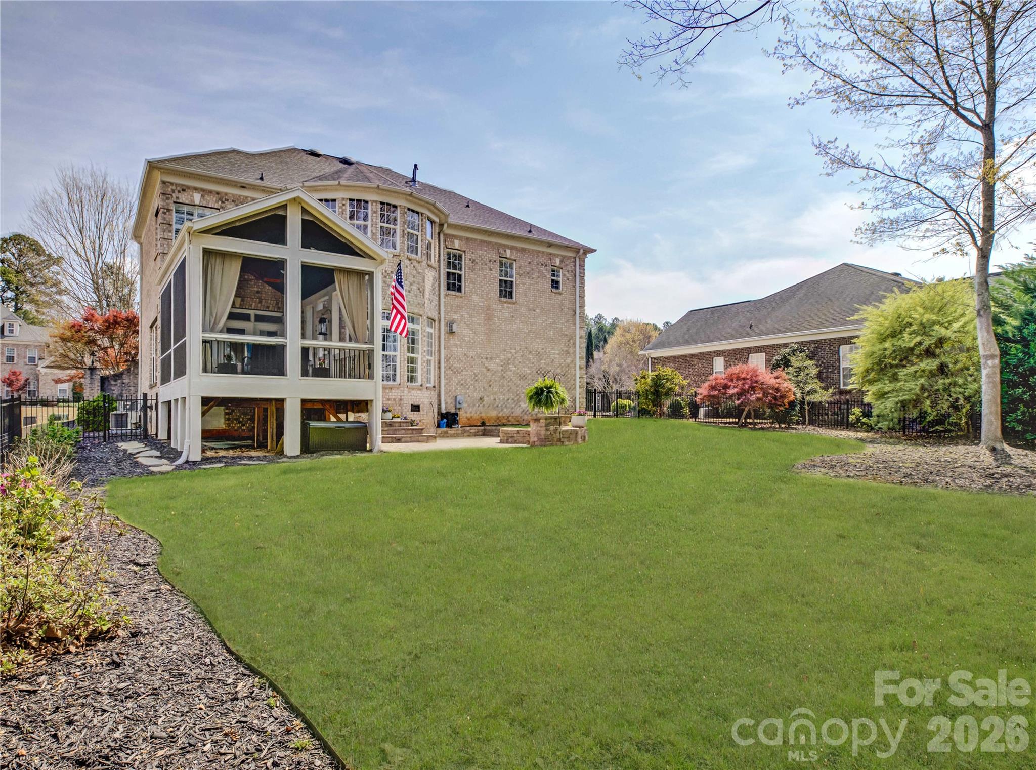 Perfectly positioned along the second tee of the Jack Nicklaus-designed Palisades Country Club, this exceptional all-brick estate welcomes you with a bright, airy two-story foyer and an elegant curved staircase. Rich hardwood floors and nine-foot ceilings flow throughout the main level, where a private office with French doors sits just off the entry, and a formal dining room with crown and chair rail molding provides an ideal space for entertaining The spacious gourmet kitchen is equipped with a gas cooktop, double wall ovens, and granite countertops, opening seamlessly to the breakfast area and great room. Here, a gas fireplace and illuminated built-ins create a warm focal point, while a graceful curved wall of windows fills the home with natural light and frames picturesque views. Outdoor living is elevated by an incredible vaulted screened porch with pull-down shades, a custom paver terrace with a built-in firepit, and an additional patio offering prime views of the golf course. A fenced yard enhances both privacy and the surrounding scenery. Upstairs, the primary suite is a true retreat featuring hardwood floors, a tray ceiling, and a spa-like bath with dual vanities, a glass-enclosed tiled shower, and a corner garden tub. Both walk-in closets are outfitted with custom closet systems. The additional bedrooms are equally well-appointed: bedrooms two and three share a Jack-and-Jill bath, while bedroom four includes a private bath and a large walk-in closet. A generous bonus room provides flexible living space, and the laundry room includes built-in storage for everyday convenience. Residents enjoy access to The Palisades community amenities, including a clubhouse, outdoor pool, fitness center, and courts for pickleball, tennis, and basketball. Optional golf and social memberships are also available at the award-winning club.