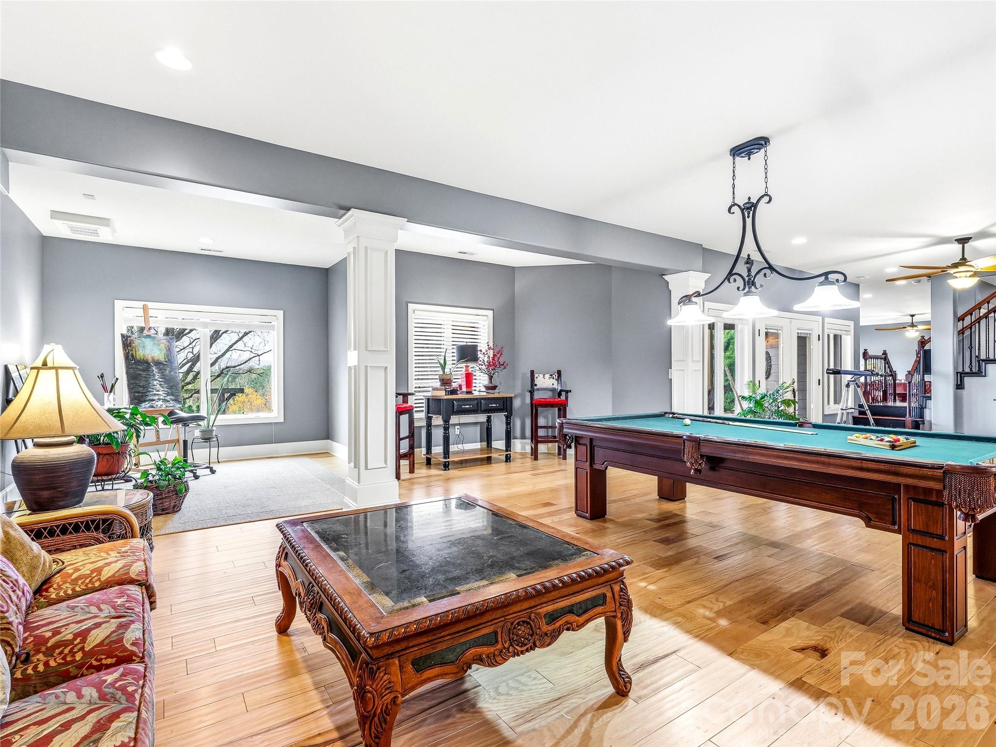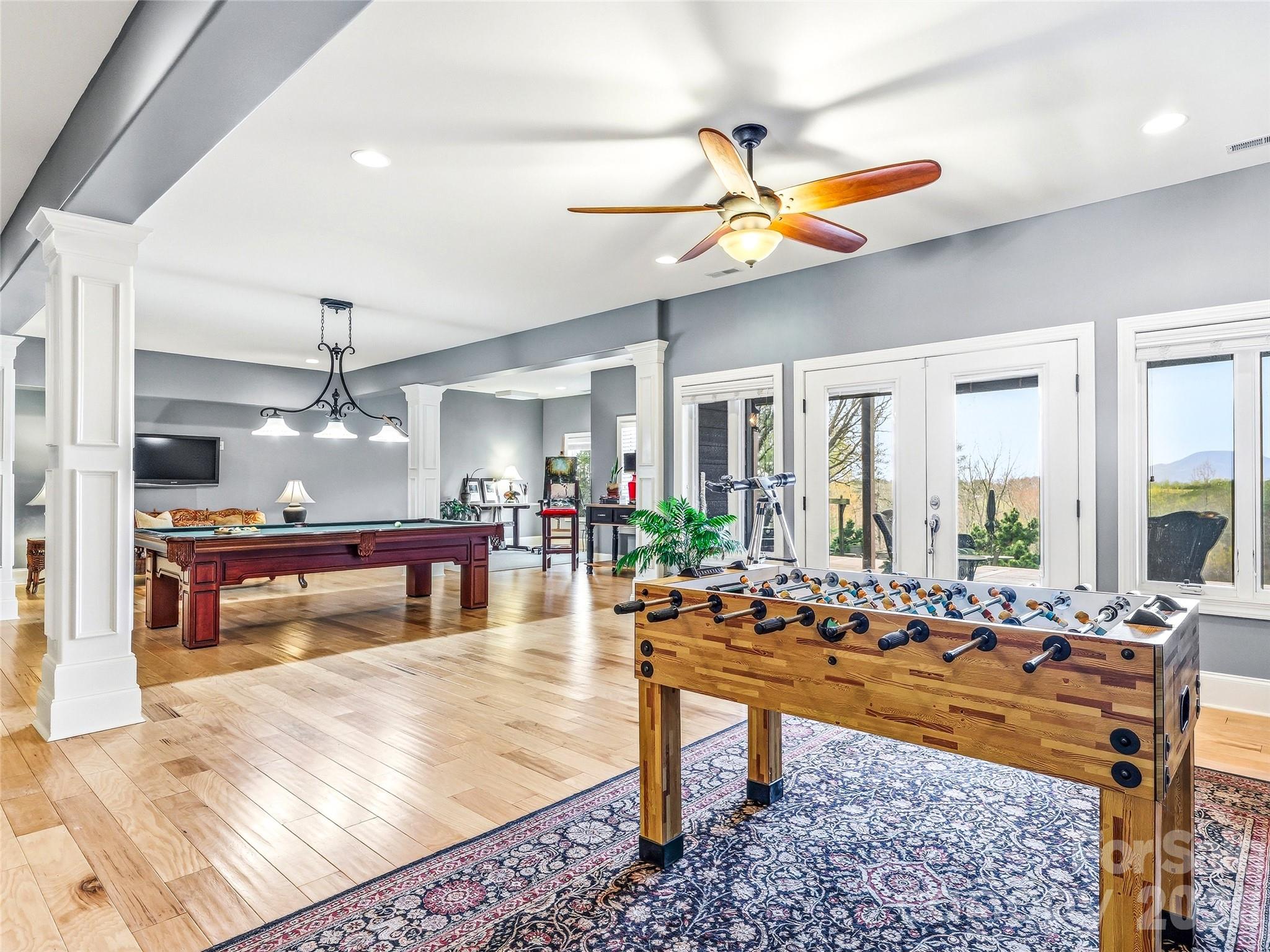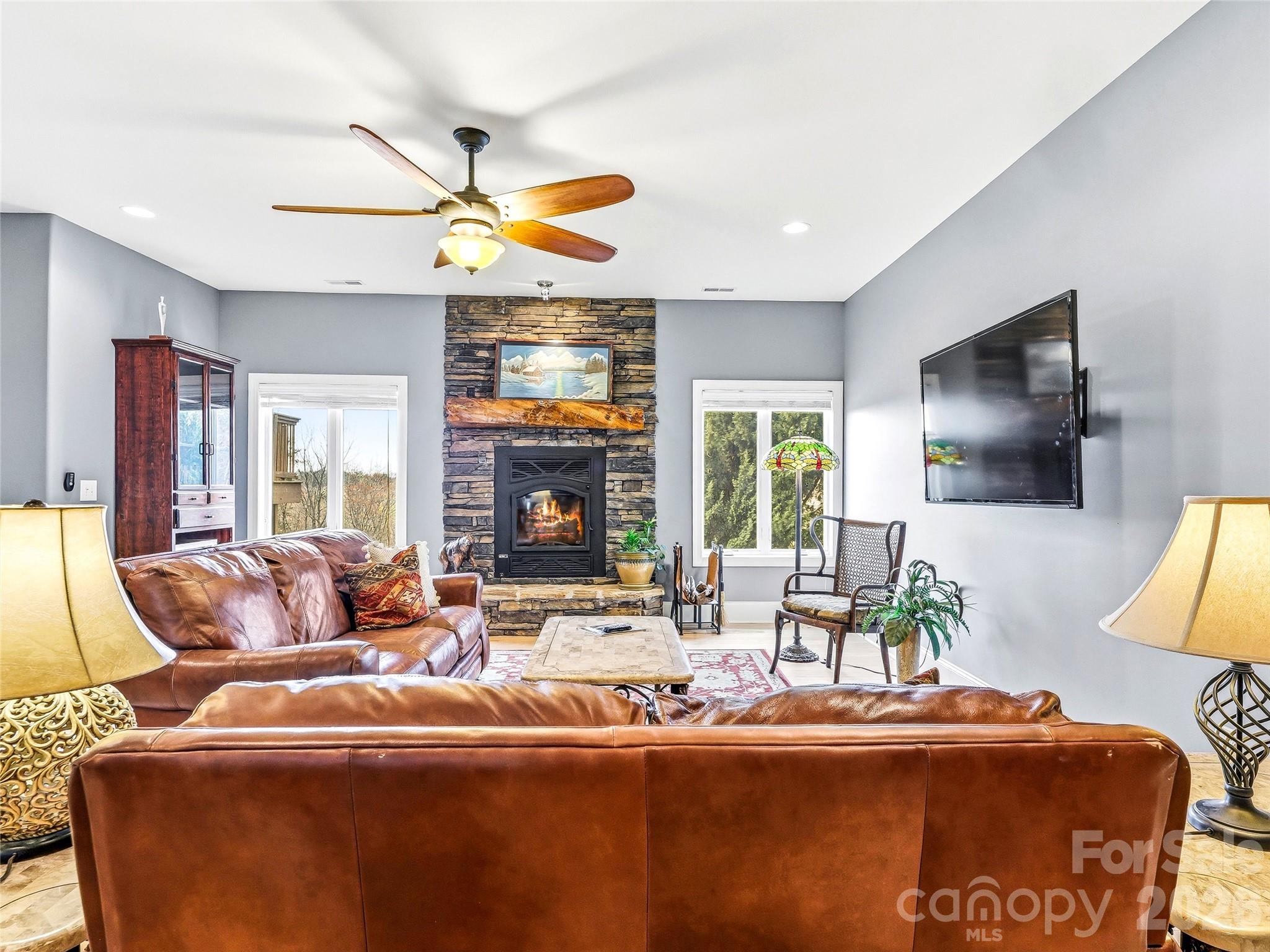 Set within a private gated community on over 6 acres of gently rolling land, this exceptional estate captures the essence of refined country living with breathtaking, year-round mountain views and direct access to the renowned FETA trail system—offering an extensive network of riding trails just beyond your doorstep. Ideally located just minutes from Landrum, Tryon, and Columbus, and in close proximity to the Tryon International Equestrian Center, this property offers a rare blend of privacy, accessibility, and lifestyle. A dramatic entry welcomes you into a stunning living room designed to showcase the landscape, where walls of glass frame the mountain views and create an unforgettable first impression. Just beyond, the great room offers a distinct yet connected gathering space, featuring soaring vaulted ceilings and a floor-to-ceiling stone fireplace. This space flows seamlessly into the gourmet kitchen and out to expansive deck areas—creating an ideal setting for both everyday living and elevated entertaining. The kitchen is thoughtfully appointed for both functionality and style, featuring a 48" Viking range, complemented by a walk-in pantry and seamless connection to the mudroom and laundry. The main level offers over 2,700 square feet of thoughtfully designed living space, including a private owner’s suite retreat with radiant heated floors in the spa-inspired bath and a generous walk-in closet. Two additional bedrooms on the main level provide flexibility for guests or a private home office. The lower level is designed for entertaining and versatility, featuring a custom bar, spacious recreation and billiards area, bonus room, and a full bathroom—ideal for hosting guests, hobbies, or flexible living needs. Direct access to the patio extends the entertaining space outdoors, while abundant storage areas add everyday practicality. Outdoors, the property unfolds into a private retreat with open grassland, professional landscaping, and a circular driveway that enhances both arrival and functionality. A detached RV barn and additional workshop/barn provide exceptional versatility for storage, hobbies, or equipment. Located just six minutes from shops, dining, and highway access—with convenient routes to Hendersonville, Greenville/Spartanburg, and both GSP and CLT airports—this estate offers the rare combination of convenience and true mountain living. An exceptional offering for those seeking space, views, and versatility in one of the region’s most desirable equestrian-access communities.