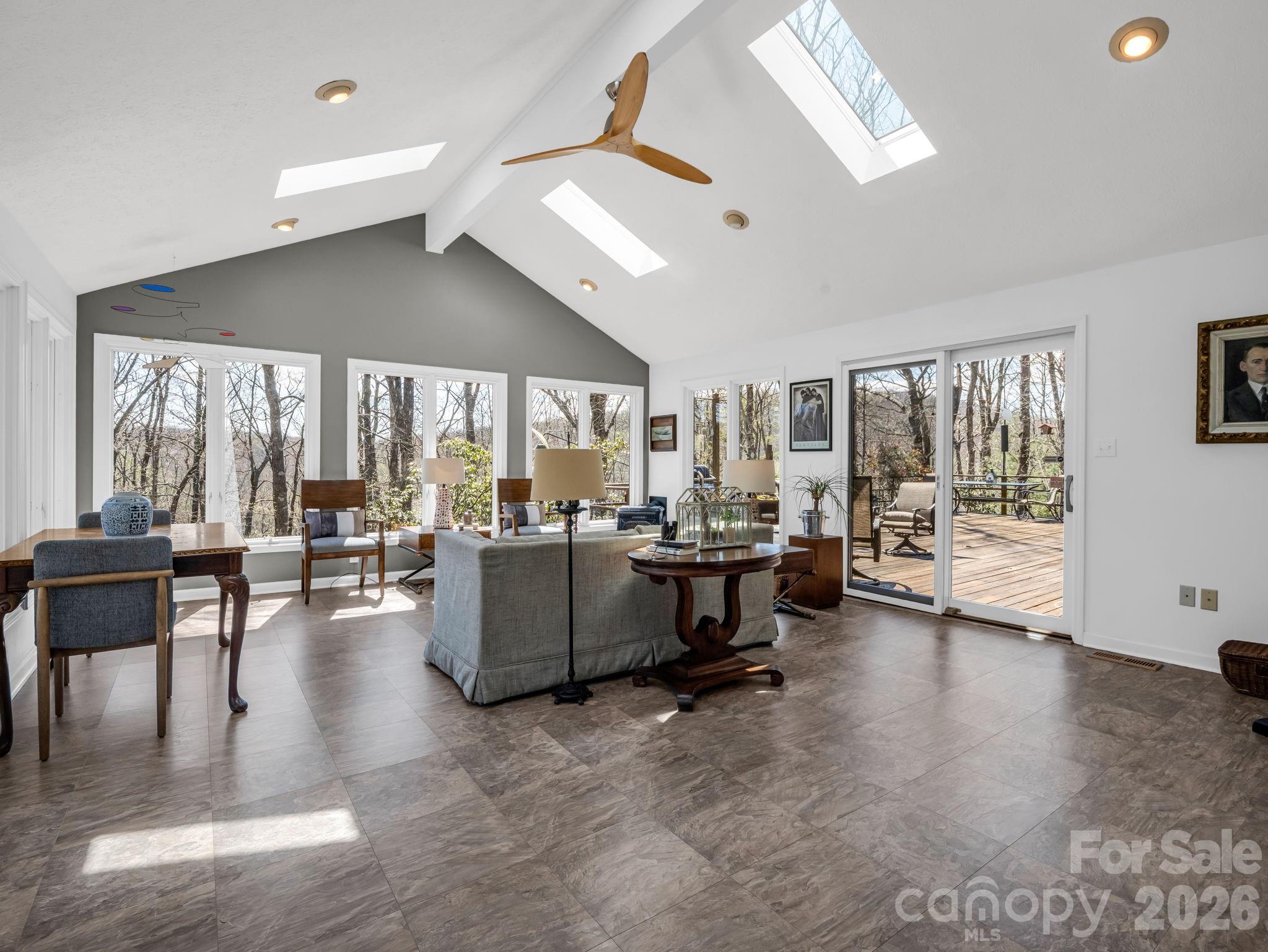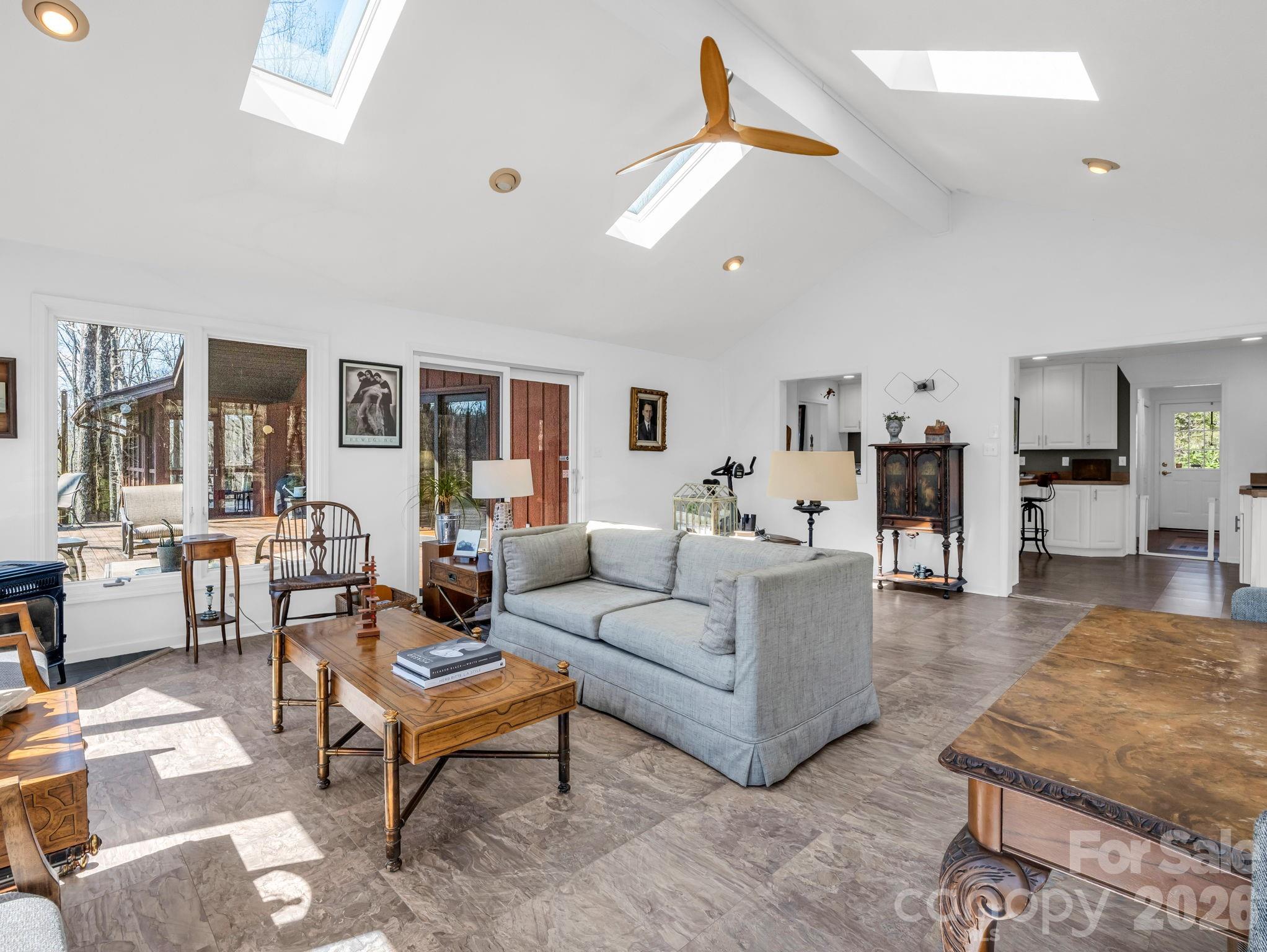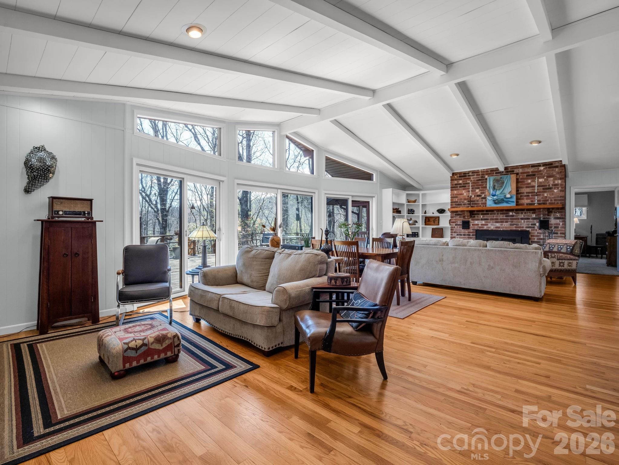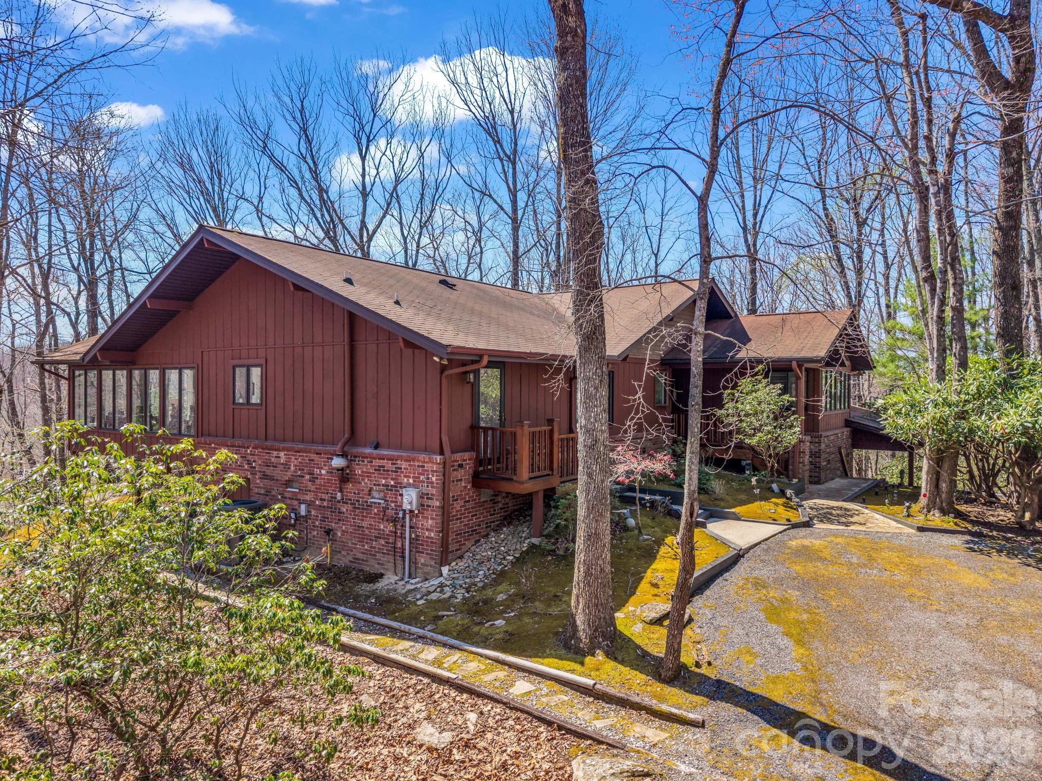 Perched atop a striking natural rock outcropping in the highly sought-after Sherwood Forest community, this unique 3-bedroom mountain retreat offers a rare blend of privacy, character, and year-round beauty. From the moment you arrive, the setting sets this home apart -perfectly positioned to capture peaceful, wooded views and an abundance of natural light. Inside, soaring vaulted ceilings and expansive windows create a bright, airy atmosphere, bringing the outdoors in and highlighting the home’s warm hardwood floors and inviting living spaces. The thoughtfully designed layout flows seamlessly to an expansive deck -ideal for entertaining, morning coffee, or unwinding in the quiet of the mountains. The updated kitchen and multiple gathering spaces provide both comfort and functionality, while the sunroom offers a tranquil spot to enjoy every season. Situated on nearly 1.5 acres, the property invites exploration with its own private hiking trail that connects directly to Sherwood Forest’s trail system and leads to the community lake- offering a truly immersive mountain experience right from your backyard. Located within Sherwood Forest- a 1,000-acre private community with over 400 acres of preserved green space-residents enjoy access to 20+ miles of hiking trails, lakes, golf, tennis, and a strong sense of community. Just minutes from downtown Brevard, known as the “Land of Waterfalls,” you’ll enjoy easy access to Pisgah National Forest, Dupont State Forest, world-class hiking and biking, and the renowned Brevard Music Center, bringing nationally recognized performances and culture to your backyard. Whether you're looking for a full-time residence or a mountain getaway, this property delivers the lifestyle buyers are searching for.