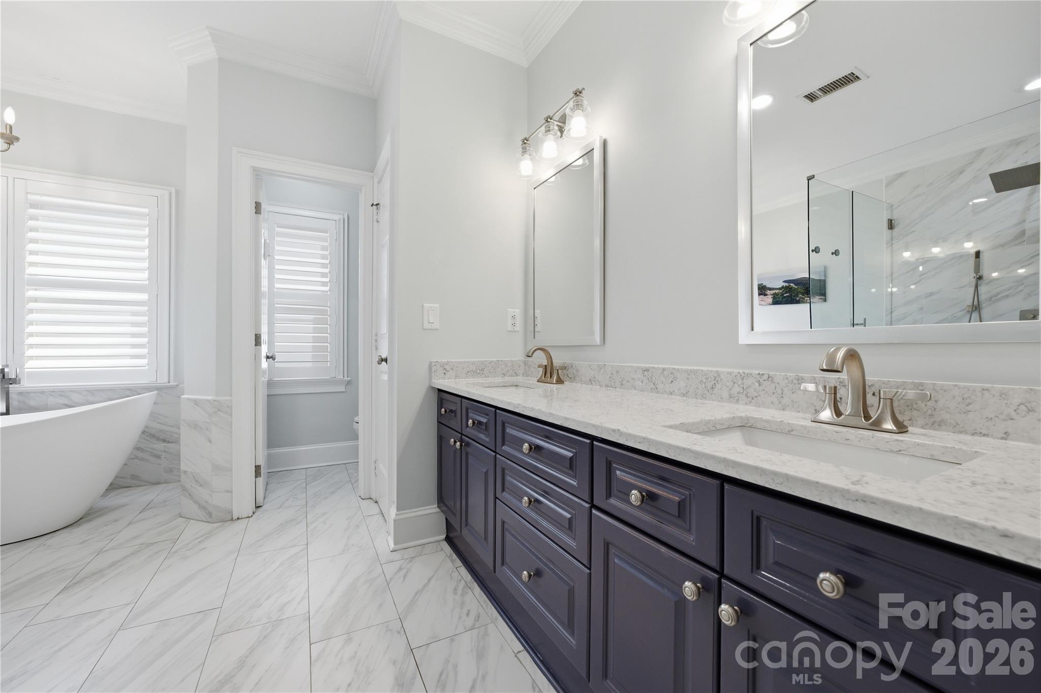 Welcome to 4118 Sharon Commons Lane, a comprehensively renovated 2,588 sq ft brick home tucked inside Sharon Commons, a private 20-home gas-lamp enclave on a cul-de-sac in Charlotte's most coveted zip code. Purchased in August 2022 and transformed through 2026, this 3 bedroom, 3 full bath, 1 half bath home features a main-level primary suite, a spa-level primary bath with custom shower, new soaking tub, and smart bidet toilet. An all-new kitchen with gas stove, farm sink, barn door pantry, and custom cabinetry, all-new hardwood floors and stair treads, plantation shutters on every window, updated recessed lighting and fixtures throughout, freshly painted interior and exterior, new front door (2026), keypad locks, and a fully rebuilt powder room, plus a third full bathroom added by the seller post-purchase. The rear yard was transformed into a private outdoor retreat with artificial turf, a gas-connection, metal pergola, color-changing water feature, drip irrigation, and all new exterior lighting on timers, all on a private brick-fenced cul-de-sac lot. The garage features an EV charger, gas line, painted floor. HVAC is dual-zone with the upstairs unit replaced brand new in 2025 and gas extended throughout the home to the kitchen, patio, and garage. The Sharon Commons HOA at $160/month covers front lawn maintenance and the signature gas street lights that define this community's charm. Step outside and you are two minutes from SouthPark Mall, the most exclusive shopping destination in the Carolinas, four minutes from Steak 48, Whole Foods, and RH Charlotte, walking distance to the Harris YMCA and Little Sugar Creek Greenway, eight minutes to Quail Hollow Club, and eighteen minutes to Charlotte Douglas International Airport.
