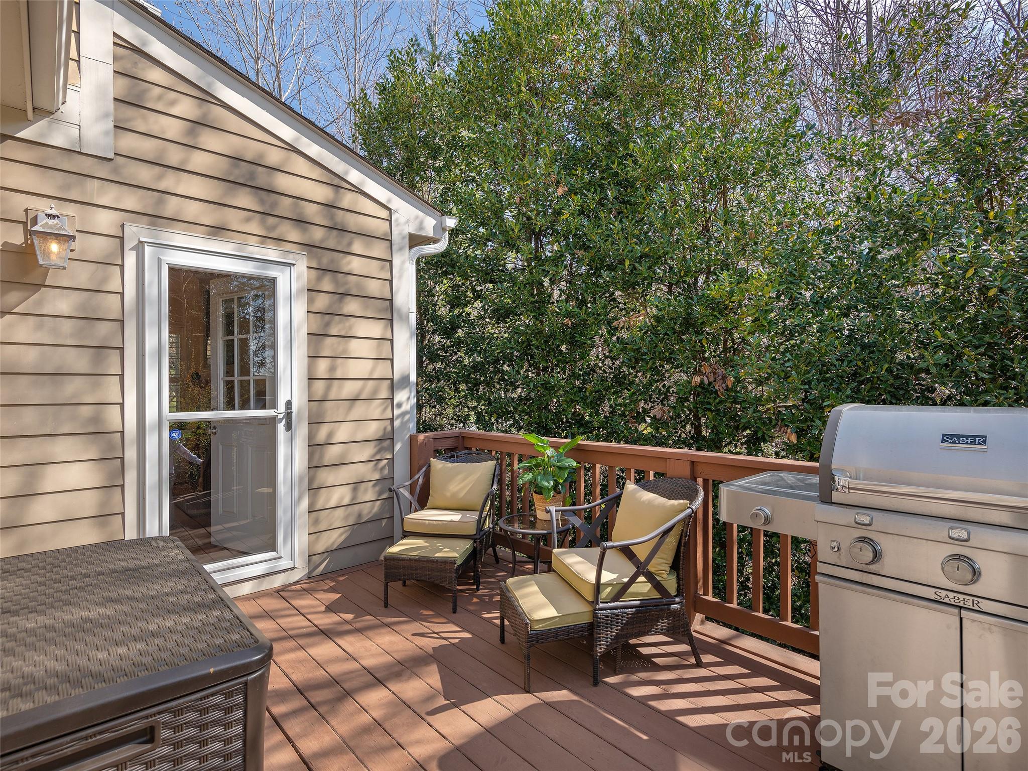With its storybook curb appeal, rocking front porch, and undeniable charm, this Biltmore Park cottage delivers sophistication and effortless livability in 2,020 square feet. Gorgeous hardwood floors, a soothing color palette, plantation shutters, and designer finishes create an ambiance fit for House Beautiful. Spacious kitchen with island and granite countertops, gas fireplace in the great room, and a rare main-level primary suite with walk-in closet, double vanity, tiled soaking tub, and separate shower, plus main-level laundry with nearly-new Bosch W/D and utility sink. Upstairs, two bright bedrooms share a lovely bath and a quaint balcony. Sunny deck framed by mature hardwoods, level yard with purple rhododendrons, detached two-car garage with breezeway. New in 2024: two heat pumps, storm doors, and fans. Steps to the greenway, upscale shopping, dining, fitness, the seasonal farmer's market, and the community pool just down the street. Homes this special don't last!