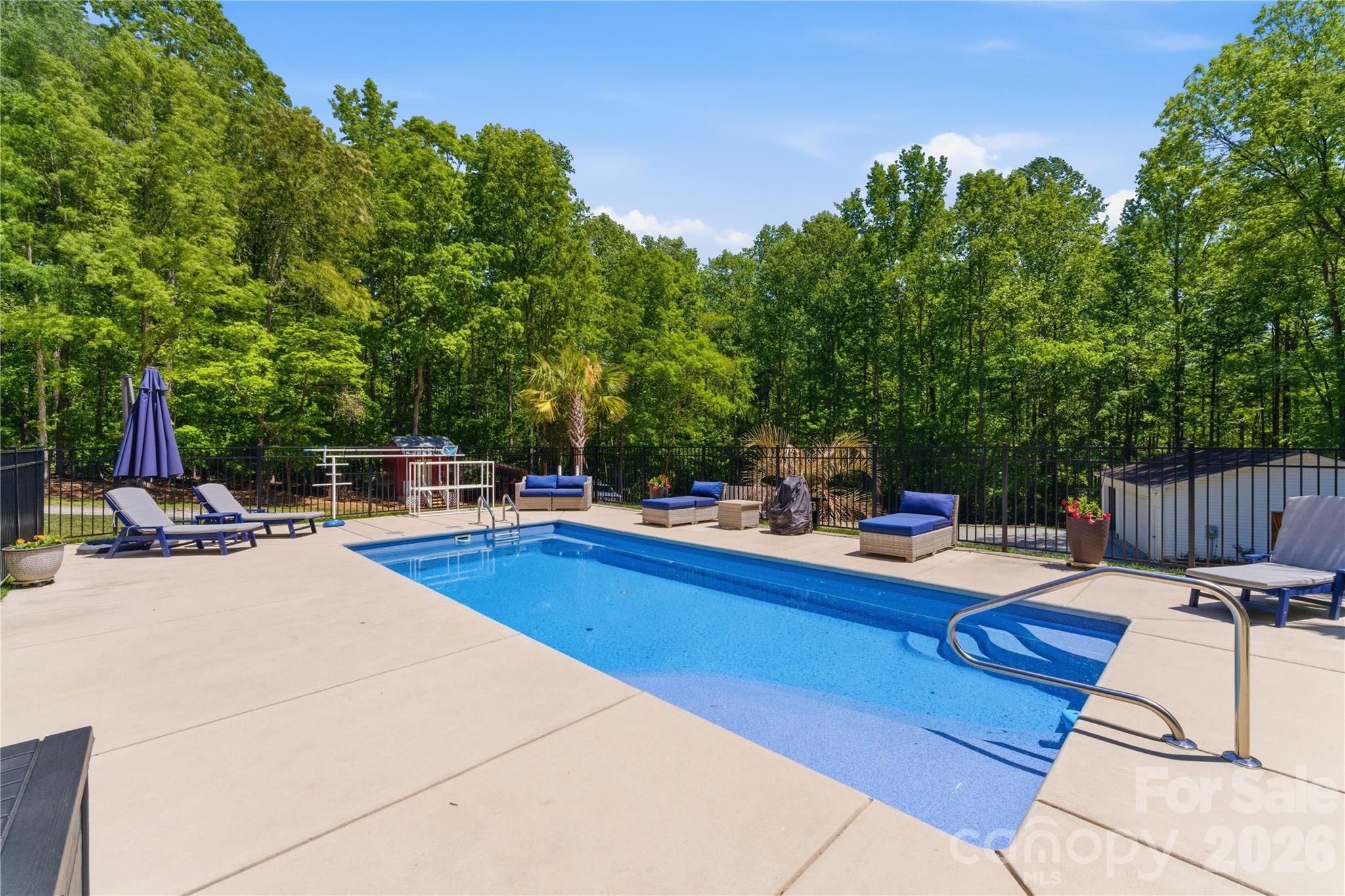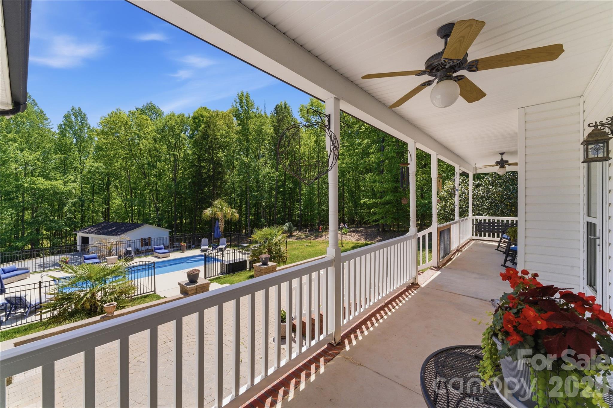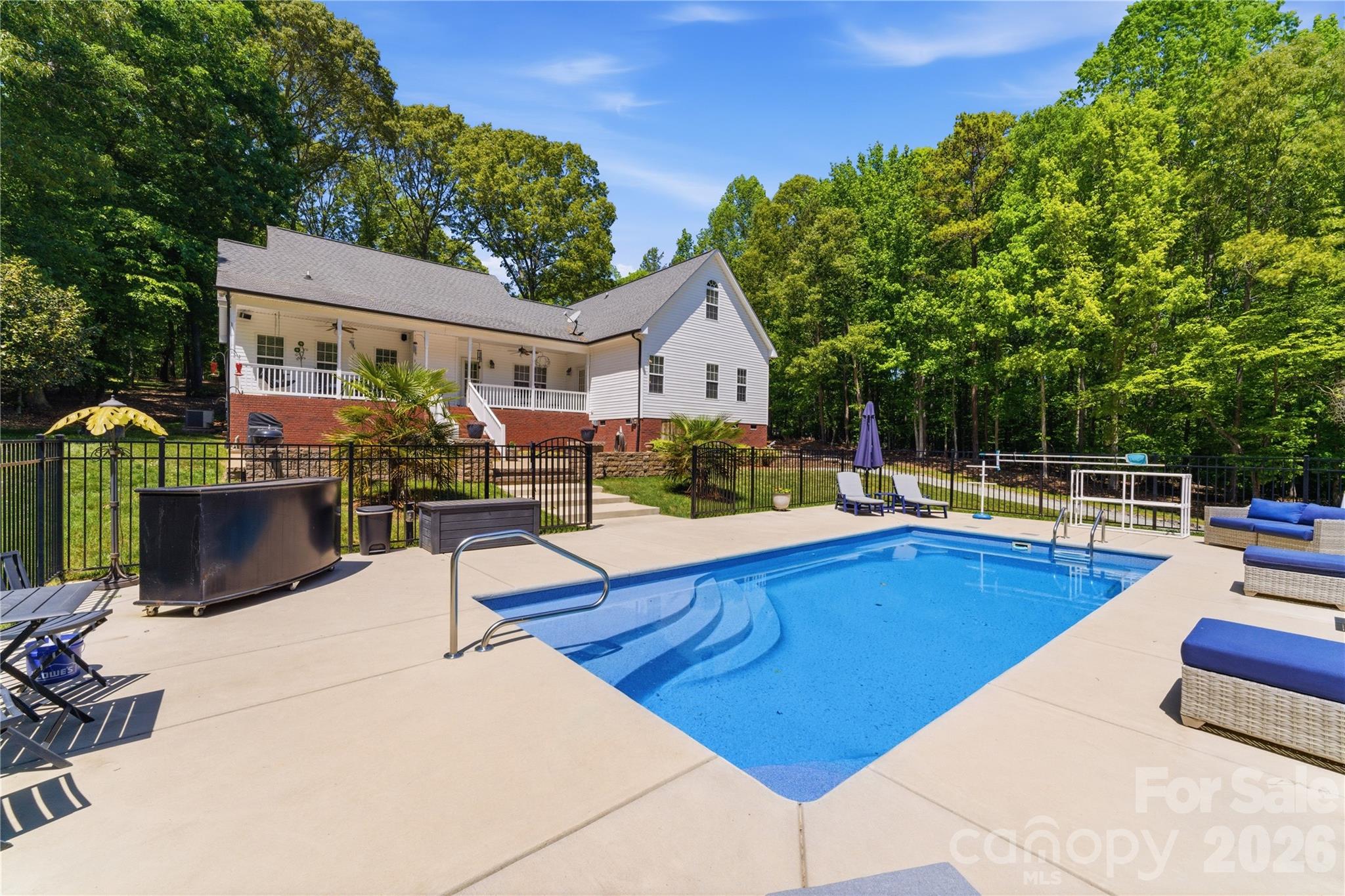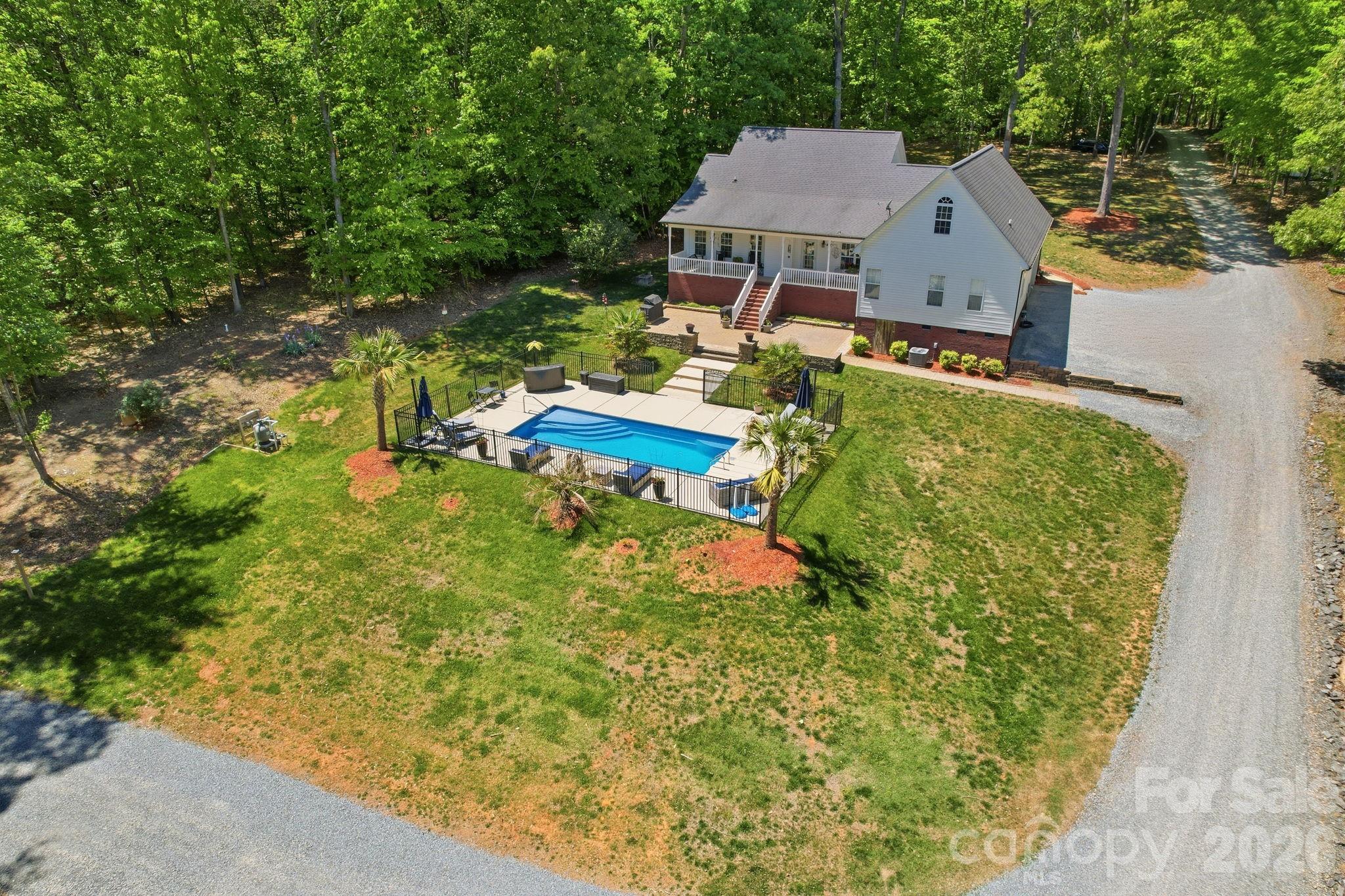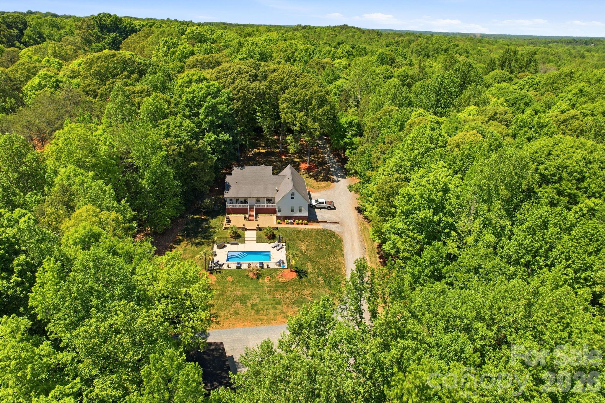 Situated on 3.51 private, wooded acres just minutes from downtown Waxhaw’s charming historic district, this one-owner home has been well maintained and offers a rare blend of privacy, space, and lifestyle—close to shops, restaurants, and local events, yet quietly tucked away from it all. A welcoming covered front porch—anchored by a charming entry and striking red front door—sets the tone as you arrive, leading into a thoughtfully designed home with a functional and inviting layout. The main living area is open and welcoming, with a vaulted ceiling, warm wood floors, a great room with fireplace, and a seamless flow into the dining area and kitchen—ideal for both everyday living and entertaining. The kitchen is filled with natural light and features abundant wood cabinetry and generous counter space, all at the heart of the home. A desirable split-bedroom floor plan provides privacy, with the primary suite on one side, featuring a spacious private bath complete with a soaking tub, walk-in shower, and a large walk-in closet. Two additional bedrooms are located on the opposite side with a full bath in between. Upstairs, two versatile bonus spaces offer flexibility for a variety of uses. One is a private room with its own half bath—perfect as a bedroom, guest room, office/flex space, or second living area—while the open bonus area, currently used as a sewing room, would make an excellent home office, media room, artist studio, or additional living space. The attached 2-car garage has finished walls and an additional storage closet, adding everyday convenience and functionality. Step outside and the property truly stands out! The private backyard is designed for both relaxation and entertaining, featuring a full-length covered back porch that overlooks an expansive stone terrace/patio and in-ground swimming pool. The stone terrace adds warmth and character, creating an inviting space to gather, unwind, and enjoy the peaceful, wooded setting. The in-ground pool becomes the centerpiece of outdoor living during the warmer months—perfect for hosting summer parties, weekend cookouts, or simply enjoying a quiet afternoon by the water. With plenty of room for lounge seating, dining, and entertaining, this backyard offers a seamless blend of comfort and functionality, making it ideal for both intimate evenings and larger gatherings. Beyond the immediate backyard, the land opens up to a beautiful natural setting with a creek along the rear of the property. With usable acreage and a mix of open and wooded space, this property is well-suited for a variety of lifestyles— including keeping chickens, maintaining gardens, as well as horses and other livestock. A small outbuilding with fenced area is currently serving as a storage building with a small dog house and fenced dog yard. This would also make an excellent chicken coop. In addition to the main home, there is a two-car carport and a detached 3-car garage. Two bays of the garage function as a traditional garage space, while the third bay has been finished as a man-cave with bar and upgraded interior—ideal for hobbies, entertaining, or a separate retreat. (bar is removable - but may stay if buyer desires). With acreage, privacy, no HOA and a location just minutes from the heart of Waxhaw, this is a rare opportunity to enjoy both convenience and country living.